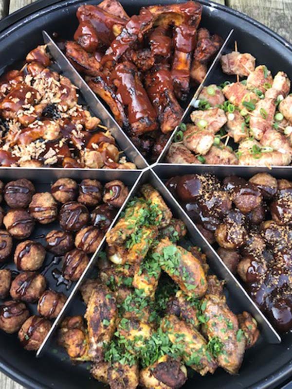 Heerlijke warme hapjes in een handomdraai op tafel, ca. 140 stuks geselecteerd voor u: Gegrilde osseworst Javaanse balletjes Kipballetjes in pruimensaus Mini kipsate in japanse sesam saus Spare ribs met BBQ saus Gemarineerde kipsticks Katenhaasjes (varkenshaas in katenspek)