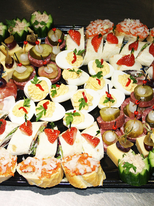 Gevuld met 75 vers bereide hapjes:Gevulde eierenBlokjes kaas met fruitgarnituurKomkommer gevuld met tonijnBroodje filet americainGevulde wrapBoeren metworst met augurkRauwe ham met meloen