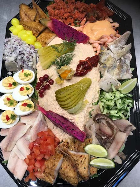 Zalmsalade met diverse vis en garneringen.